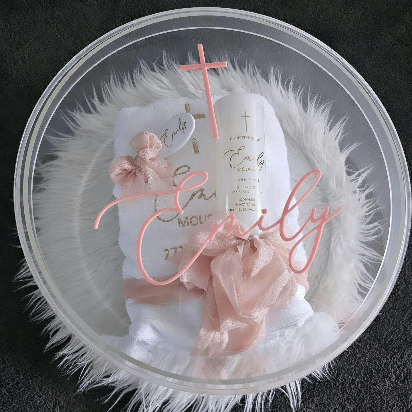 Mark life’s sacred milestones with this Luxury Personalised Keepsake Gift Set, thoughtfully curated to celebrate faith and meaningful moments. Nestled inside a premium round acrylic keepsake box is a trio of elegant pieces: a custom-cut gold acrylic name plaque, a beautifully wrapped personalised Bible, and a timeless set of rosary beads. Designed to be as heartfelt as it is visually striking, this set is perfect for First Holy Communion, Christenings, Weddings, and other special celebrations. A lasting gift to be treasured for years to come.